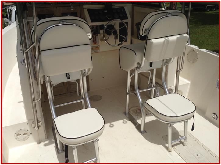 30", 32", 34" or 36" Includes 4 rod holders and flip footrest. Standard height is 32". Seat height can be adjusted. Choice of flat or pleated vinyl in white or off-white. Stripes or colored piping additional. |